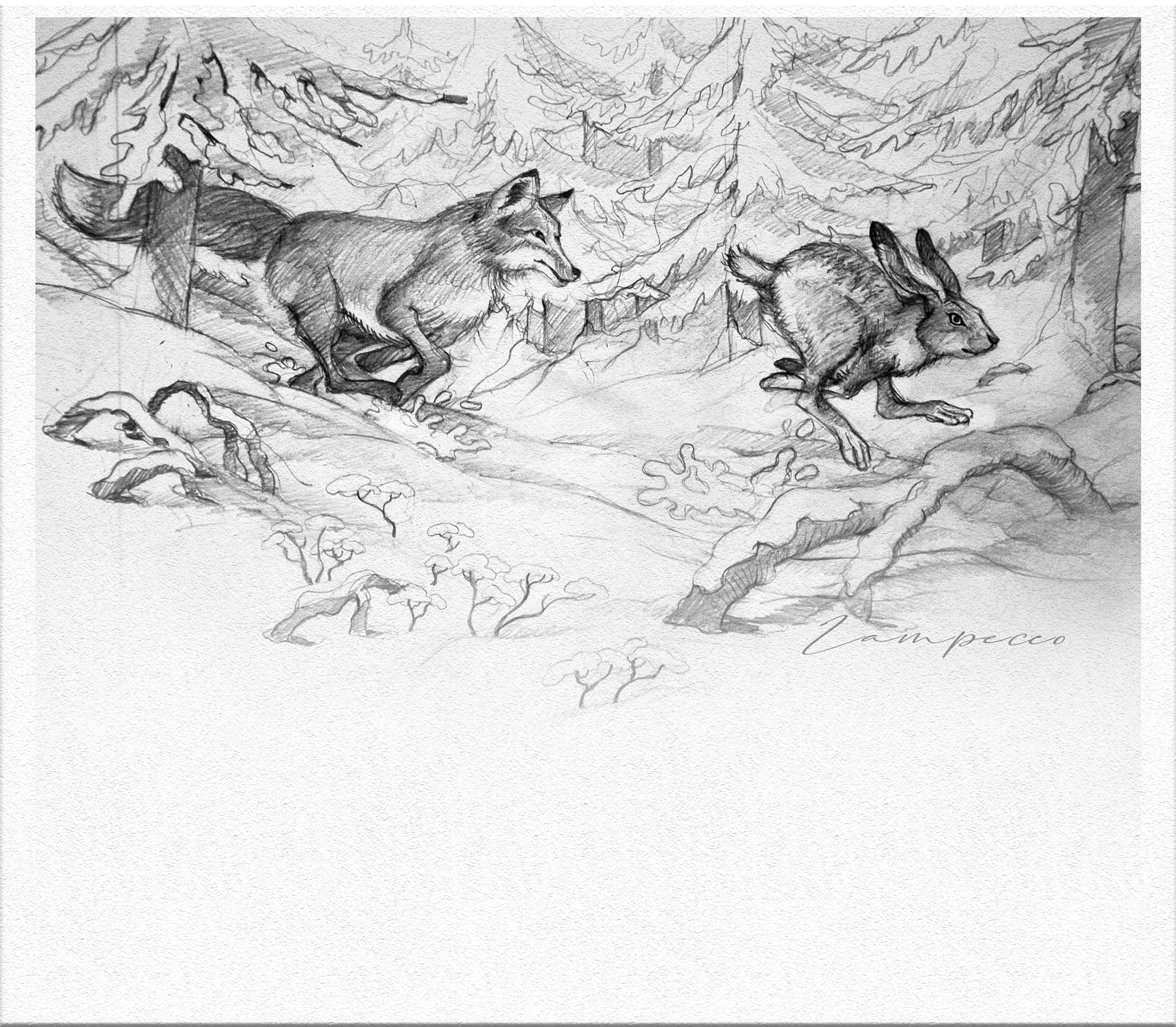 En cette fin d’année 2020, la poésie des Noëls blancs m’inspire quelques esquisses… Ce dessin me rappelle, je ne sais trop pourquoi, ces illustrations qui décoraient les jeux de l’oie de mon enfance… Mais il illustre aussi l’unviers des contes et des fables, serait-ce « Le Renard & le Lièvre » ?…